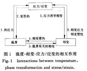 鋼在淬火過(guò)程中存在極為復(fù)雜的溫度、相變、應(yīng)力/應(yīng)變相互作用,在此方面已有許多報(bào)道[1]。如圖1所示,在淬火過(guò)程中,溫度造成熱應(yīng)力并影響材料的力學(xué)參數(shù)(彈性模量、泊松比、屈服強(qiáng)度和應(yīng)變硬化率等),從而影響材料的力學(xué)行為。應(yīng)力/應(yīng)變則以變形熱的形式反過(guò)來(lái)影響溫度的變化。隨著溫度的降低,在達(dá)到相變條件后將發(fā)生相變。溫度是決定相變的因素之一,但其本身又受著相變潛熱的影響。內(nèi)應(yīng)力的存在,可通過(guò)一種通常稱為應(yīng)力誘導(dǎo)相變的機(jī)制而影響相變的進(jìn)程。在相變過(guò)程中,各組成相的比容差異將造成相變應(yīng)力,同時(shí)由于材料的絕大多數(shù)參數(shù)除了依賴于溫度實(shí)際上也依賴于相態(tài),因此,相變也會(huì)對(duì)材料的力學(xué)行為產(chǎn)生影響。此外,在有內(nèi)應(yīng)力存在時(shí)相變過(guò)程中還會(huì)伴隨一種“反�!钡乃苄孕袨�,即材料在應(yīng)力低于屈服強(qiáng)度的情況下就可以發(fā)生不可逆變形的現(xiàn)象,稱為相變塑性。