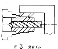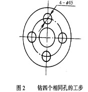 如圖2所示零件,連續(xù)鉆四φ15mm的孔,可看作一個(gè)工步鉆4孔φ15mm,以簡(jiǎn)化工藝文件,另一種情況,有時(shí)為了提高生產(chǎn)率,用向把不同刀具,同時(shí)加工幾個(gè)不同表面,如圖3,也可看作一個(gè)工步,稱(chēng)為復(fù)合工步。