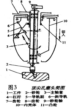 用頂尖孔磨床磨削頂尖孔,如力3所示的頂尖孔磨床,為立式磨床,下面有頂尖撥盤可以帶動工件轉(zhuǎn)動,工件上端支承在由兩小圓柱組成的V形體上,與工件圓柱或圓錐面成線接觸。磨頭有三個(gè)運(yùn)動:1主切削運(yùn)動,由砂輪軸9帶動砂輪高帶旋轉(zhuǎn);2行星運(yùn)動,齒輪7帶動砂輪軸9作以e為貪偏心量的行星運(yùn)動;3往復(fù)運(yùn)動,齒輪7與內(nèi)殼體10及斜導(dǎo)軌6成為一體,由徑向及推力軸承支承作回轉(zhuǎn)運(yùn)動,齒輪8帶動凸輪子11 轉(zhuǎn)動,并推動杠桿4,帶動斜導(dǎo)軌副5沿斜導(dǎo)軌作30度往復(fù)滑動,,克用因砂輪各點(diǎn)線速度不同造成的誤差。該機(jī)床加工精度為圓度0.8ium,,表面粗糙度值為Ra0.32.