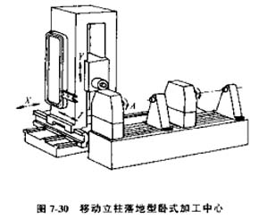 1)落地型(圖7-30)立柱作X、Z向運(yùn)動(dòng),主動(dòng)箱在立柱上作Y向運(yùn)動(dòng),可配備落地式工作臺(tái)及回轉(zhuǎn)工作臺(tái)。適用于大型零件(特別是較長的零件)或中型零件的多面多工序加工。
