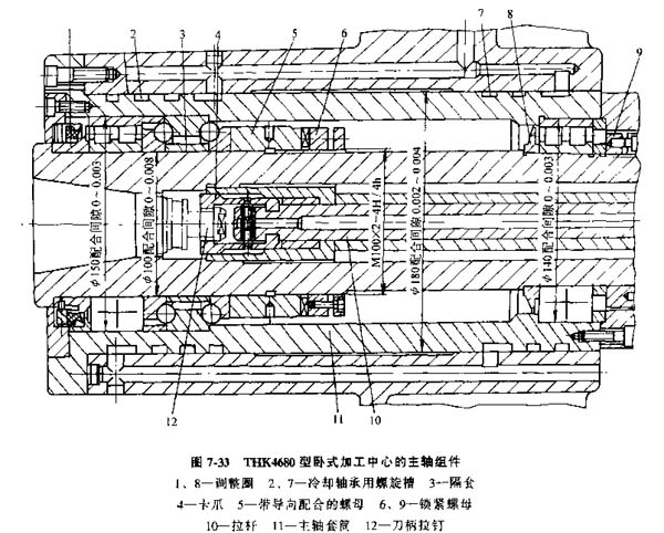 圖7-33所示為THK4680型臥式加工中心的主軸組件,其前軸承為圓錐孔雙列圓柱滾子軸承B3182120和雙向推力角接觸球軸承C2268120,后軸承為C3182118。這些軸承均經(jīng)預(yù)緊,B3182120靠修磨調(diào)整圈1.C2268120靠修磨隔套3來調(diào)整預(yù)緊量,由帶導(dǎo)向配合的螺母5.鎖緊螺母6.壓緊;后軸承靠修磨調(diào)整圈8調(diào)整預(yù)緊量,由鎖緊螺母9壓緊。主軸套筒11與主軸箱體孔由配作保證精密配合,這種高精度、高剛度的主軸組件,其錐孔軸線的徑向圓跳動(dòng)在0.003mm以內(nèi)(主軸端部)。