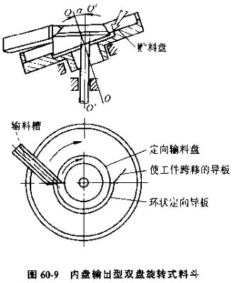 9)雙盤(pán)旋轉(zhuǎn)式料斗,雙盤(pán)旋轉(zhuǎn)式料斗由兩個(gè)軸線互成一定角度相交并同向旋轉(zhuǎn)的料盤(pán)組成,料盤(pán)一個(gè)用來(lái)貯料,另一個(gè)用來(lái)定向整理,雙盤(pán)旋轉(zhuǎn)式料斗可分為內(nèi)盤(pán)輸出或外盤(pán)輸出等類(lèi)型,圖60-9所示為內(nèi)盤(pán)輸出型。