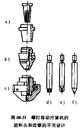 進(jìn)料頭需要根據(jù)螺釘尺寸和螺釘裝配要求設(shè)計。圖60-31為幾種不同類型的進(jìn)料頭和旋具。圖60-31a中的進(jìn)料頭適用于長徑比大于5的螺釘,進(jìn)料頭帶有一個錐形彈性鉗,內(nèi)錐通過主軸上的套筒實(shí)現(xiàn)定心。圖60-31b和圖60-31c適用于短螺釘,這兩種進(jìn)料頭別有鉸鏈?zhǔn)姐Q臂裝在軸上,關(guān)閉時形成一個螺釘直徑大小的孔,進(jìn)料時進(jìn)料頭與孔的上端接觸,在擰人螺釘?shù)倪^程中,鉸鏈臂通過旋具的設(shè)計可根據(jù)螺釘頭取相應(yīng)的結(jié)構(gòu),如六角形、十字形成或帶槽的旋具。