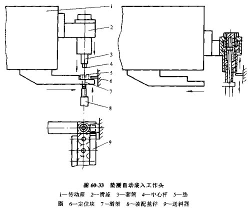 圖60-33為一種墊圈自動(dòng)裝入工作頭。墊圈5作為裝配由送料器9水平送入,呀靠滑架7和中心桿4定位。隨后滑座2下行,中心桿4插入墊圈孔內(nèi)。同時(shí),裝配基準(zhǔn)件8上升與中心桿4結(jié)合�;�7隨即退回。然后套筒3下行,用機(jī)動(dòng)推入方式完成墊圈5與裝配基準(zhǔn)件8的自動(dòng)裝配作業(yè)。
