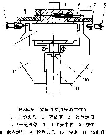 2) 裝配件夾持檢測工作頭,圖30-36所示工作頭根據(jù)夾持動(dòng)作發(fā)出的信號(hào),壓縮空氣進(jìn)入接管6,推動(dòng)雙活塞2,使止動(dòng)夾爪1及檢測夾爪9閉合,開始夾持裝配件11。正常夾持時(shí)在夾爪9與觸點(diǎn)螺釘8之間形成間隙δ,兩者之間斷路。夾持失誤時(shí)間隙消失,夾爪9與螺釘8之間形成通路,通過控制回路發(fā)出報(bào)警信號(hào)。