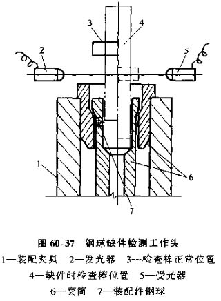 鋼球缺件檢測工作頭,圖60-37所示工作頭應(yīng)用光電檢測鋼球缺件,圖中檢測棒前端的直徑要比裝入的三個(gè)均布鋼球的內(nèi)接圓直徑略大。裝配正常時(shí),檢測棒不能通過;當(dāng)缺少一個(gè)鋼球時(shí)則可通過。用光電檢測棒所在的軸向位置,即可判斷是否缺件。