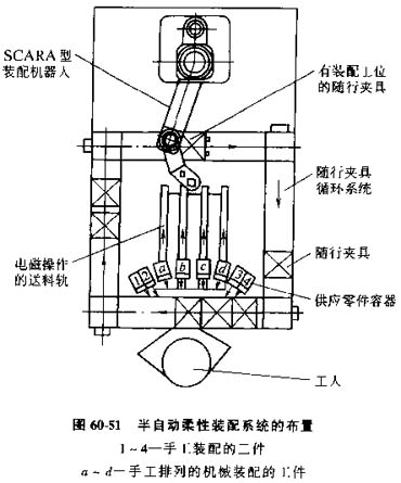 圖60-51所示為一臺(tái)半自動(dòng)柔性裝配的機(jī)布置圖,使用一個(gè)SCARA型機(jī)器人,有一個(gè)機(jī)器入裝配工位及手工工位,在機(jī)器人工位與手工工位之間有一個(gè)工件運(yùn)載系統(tǒng)。1~4等4個(gè)零件由手工裝配。多次出現(xiàn)的a~d等4個(gè)零件由同一工人手工按一定次序放入電磁送料軌道中,進(jìn)而逐個(gè)被機(jī)器人抓取并自動(dòng)進(jìn)行裝配。