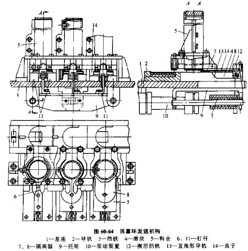 向滑塊上自動(dòng)發(fā)送活塞環(huán)的機(jī)構(gòu),圖60-64機(jī)構(gòu)有一個(gè)基座上緊固著逐個(gè)發(fā)送活塞環(huán)的料倉(cāng)5和杠桿6,在垂直于料倉(cāng)中心線的平面內(nèi)鉸接并用彈簧相互拉緊,還帶有形狀與被夾持的活塞環(huán)相似的輥?zhàn)鱼Q口,以及在料倉(cāng)下垂直其中心線的并在平面內(nèi)能移動(dòng)的隔離器7和8推板做成托架9的形式,并帶有強(qiáng)制性驅(qū)動(dòng)裝置10,推板沿導(dǎo)軌2移動(dòng),用杠桿11與滑塊4相互作用,滑塊上固定隔離器7和8以及楔形擋鐵12,在滑塊工作行程末端與彈簧杠桿6相互作用�;瑝K連同不動(dòng)的固定隔離器可以在固定于基座上的直角形導(dǎo)軌13內(nèi)移動(dòng)。隔離器上面用蓋子14蓋住,靜止地架在直角形導(dǎo)軌13上面