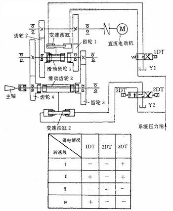 HC212ДФ1鏜銑床(主軸直徑220mm)是馬鋼機(jī)制公司90年代從俄羅斯進(jìn)口的大型機(jī)床。該機(jī)床主軸調(diào)速是通過主軸箱內(nèi)一套變速機(jī)構(gòu)和直流調(diào)速電動機(jī)共同完成的。機(jī)械變速通過液壓系統(tǒng)來控制,使主軸獲得Ⅰ、Ⅱ、Ⅲ、Ⅳ4級轉(zhuǎn)速。其控制原理如圖1所示,電磁換向閥Y1和Y2分別控制變速油缸1和2,帶動撥叉使滑動齒輪1和2處于不同的工作位置,使主軸得到不同的轉(zhuǎn)速。其中變速油缸1有兩個工作位置,油缸2有3個工作位置。