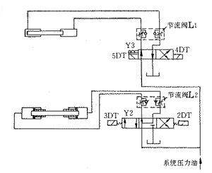 為解決問題,液壓系統(tǒng)從兩方面著手:①換向閥Y1重新選型;②在系統(tǒng)中增加速度調(diào)節(jié)環(huán)節(jié)。改造后的原理圖如圖2所示。選用國產(chǎn)24WE6D50/CFG24型電磁換向閥Y3替換Y1。閥Y3帶“記憶”功能,不因電磁鐵失電而改變閥芯位置。在Y3、Y2出油口處增加了節(jié)流閥組L1、L2,使變速油缸1、2獲得理想的運(yùn)動速度。
