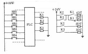 由于閥Y3帶有2個電磁鐵(4DT、5DT),且為“非”關(guān)系,如何從已占滿的PLC輸出端點中引出一控制信號來控制5DT呢(圖3)?若增加一輸出端點來控制5DT,勢必要增加輸出模塊,并要修改梯形圖,從而大大增加了改造費(fèi)用。為此我們對PLC輸出點進(jìn)行了一些改動(圖4),圓滿地解決了PLC輸出點不足的問題。把PLC原來直接推動電磁鐵改為推動中間繼電器K1、K2、K3,然后由K1、K2、K3來控制電磁鐵4DT、5DT、2DT、3DT。通過K1的常開和常閉點,使4DT和5DT滿足了“非”的關(guān)系。