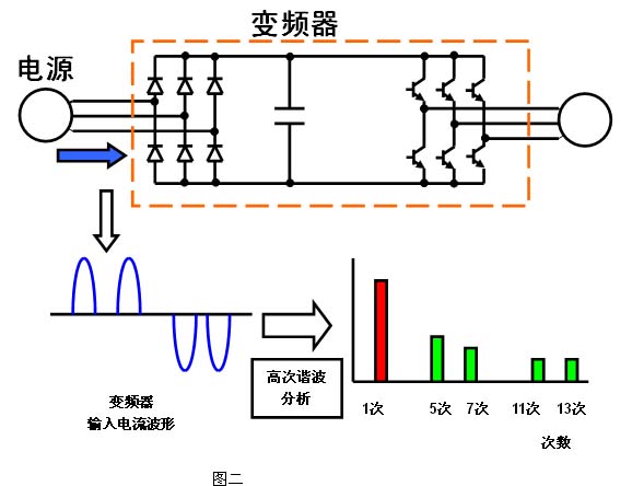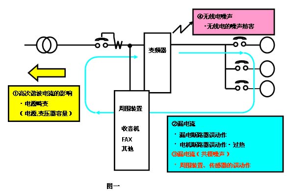 電磁干擾也稱電磁騷擾(EMI),是以外部噪聲和無用信號(hào)在接收中所造成的電磁干擾,通常是通過電路傳導(dǎo)和以場(chǎng)的形式傳播的。變頻器的整流橋?qū)﹄娋W(wǎng)來說是非線性負(fù)載,它所產(chǎn)生的諧波會(huì)對(duì)同一電網(wǎng)的其他電子、電氣設(shè)備產(chǎn)生諧波干擾。如下圖一所示: