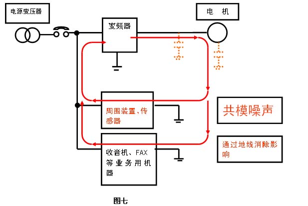 其次,共模干擾通過變頻器的控制信號(hào)線也會(huì)干擾變頻器的正常工作。如圖七所示: