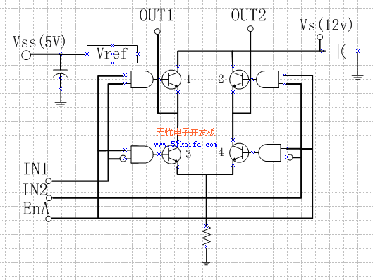另一個(gè)H橋的工作原理同上。由EnB控制OUT3和OUT4之間電機(jī)的停轉(zhuǎn),根據(jù)IN3、IN4腳的輸入電平情況控制OUT3和OUT4之間電機(jī)的轉(zhuǎn)向。