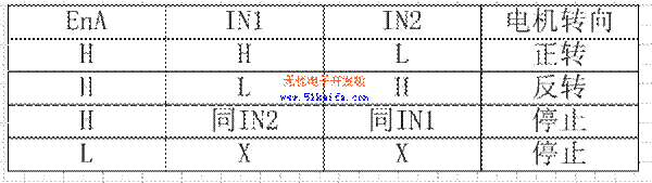 為提高系統(tǒng)效率、降低功耗,功放驅(qū)動(dòng)電路采用基于雙極型H橋型脈寬調(diào)制方式(PWM)的集成電路L298N。L298N是SGS公司的產(chǎn)品,內(nèi)部包含二個(gè)H橋的高電壓大電流橋式驅(qū)動(dòng)器,接收標(biāo)準(zhǔn)TTL邏輯電平信號(hào),可驅(qū)動(dòng)46伏、2安培以下的電機(jī),工作溫度范圍從-25度到130度。其內(nèi)部的一個(gè)H橋原理圖如圖1所示。EnA是控制使能端,控制OUTl和OUT2之間電機(jī)的停轉(zhuǎn), IN1、IN2腳接入控制電平,控制OUTl和OUT2之間電機(jī)的轉(zhuǎn)向。當(dāng)使能端EnA有效,IN1為低電平IN2為高電平時(shí),三極管2,3導(dǎo)通,1,4截止,電機(jī)反轉(zhuǎn)。當(dāng)IN1和IN2電平相同時(shí),電機(jī)停轉(zhuǎn)。表1是其使能引腳,輸入引腳和輸出引腳之間的邏輯關(guān)系。