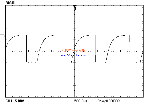 圖4是由示波器產(chǎn)生的PWM頻率為1KHz,占空比80%,電機(jī)正轉(zhuǎn)時(shí)的調(diào)制波形。