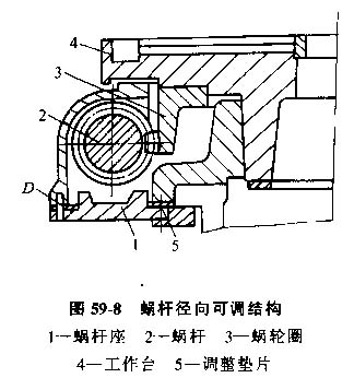 實(shí)現(xiàn)側(cè)隙調(diào)整可用徑向調(diào)或軸向可調(diào)結(jié)構(gòu),蝸桿徑向可調(diào)結(jié)構(gòu)見(jiàn)圖59-8。這種蝸桿傳動(dòng)的加工工藝一般是:待蝸輪圈3裝合在刮研好的工作臺(tái)4上精加工無(wú)論癡面后,按齒面接觸斑點(diǎn)分布狀況,配磨蝸桿2的齒面。在檢驗(yàn)機(jī)上按一定的中心距,檢查蝸輪齒面接觸斑點(diǎn),確保在規(guī)定的嚙合側(cè)隙情況下達(dá)到正常接觸,然后進(jìn)行裝配。裝配時(shí),先刮研蝸桿座1的裝配基準(zhǔn)D,并保證蝸桿座上裝蝸桿的軸承孔的軸線對(duì)D面的平行度精度。配磨調(diào)整墊片5,以保證蝸桿軸線位于蝸輪齒的中央截面內(nèi)。同時(shí)徑向微調(diào)蝸桿座,達(dá)到規(guī)定的接觸斑點(diǎn)后,配鉆、鉸蝸桿座與底座的定位銷孔,裝上定位銷,擰緊螺釘。