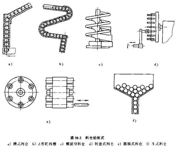 表50-1列出了典型的料斗形式,適用工件以及技術特性,供選擇定向方法和確定料斗機構時參考。