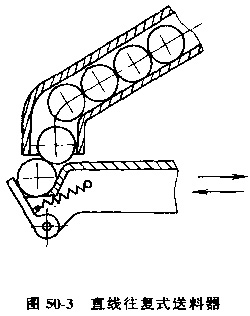 A.直線往復式送料器(見圖50-3)它帶有V形手部,工件落入手部后,彈簧板夾著工件送至機床夾具中,送料器返回時,彈簧板可讓開工件。送料器上表面兼有隔料作用。