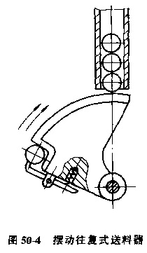b.擺動式送料器,圖50-4是帶動式送料器,其搖臂上面為工件止動面,兼有隔料作用。擺臂運動可由氣壓、液壓、機械傳動。擺動式送料器結構比直線簡單,不需較長的滑動導軌,節(jié)省空間,送料速度快。