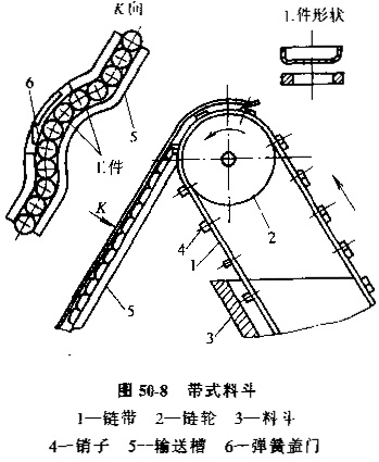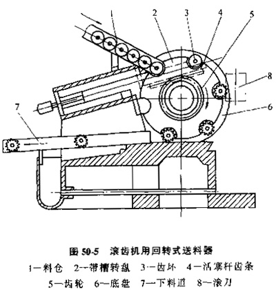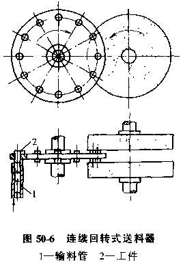 A.回轉式送料器,圖50-5是滾齒機上用的回轉式送料器,當帶狗槽的轉盤旋轉時,槽口順次經過料倉的靠口處,單個工件落入槽口。轉盤外圓柱面為工件止動面兼隔料作用。隨著轉盤的間歇轉動,坯料被送到加工工位,加工完的工件被送至下料道。