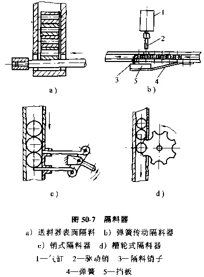 50-7a為利用直線往復式送料器的表面隔料。圖50-7b是利用氣缸和彈簧傳動的隔料器,隔料銷子在彈簧4作用下插入料槽,擋住工件,當氣缸1驅動銷2插入料槽將第二個件隔位時,其前端頂在擋板5上,使銷子退出料槽,將第一個工件放行。圖50-7c為機械傳動的銷式隔料器,圖50-7d為槽輪式隔料器。