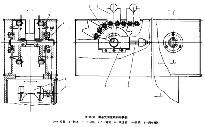 如圖50-56所式,它由兩列封閉式鏈條、鏈輪和驅(qū)動裝置所組成。用于支承工件及定位的V形板1,等距地固定在鏈條2的削軸上,隨同鏈條一起運動。鏈條由電動機通過減速器6和鏈輪5、4傳動,為了防止鏈條下垂,每個環(huán)節(jié)側(cè)面的滾子支承在導板3上,在減速器軸端裝有電磁離合器。用來實現(xiàn)鏈條的準確停止。鏈條的松緊可以通過螺釘8和滑塊7調(diào)節(jié)。