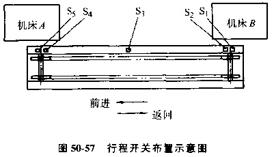 為了控制不同的工作過程,在料道上裝有五個行程開關(guān),由工件在行程開關(guān)上發(fā)出信號,見圖50-57。其控制過程為: