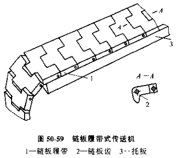 鏈板履帶式傳送機是采用一節(jié)節(jié)帶齒的鏈板組成的,鏈板表面磨光,靠摩擦力傳送工件,見圖50-59。