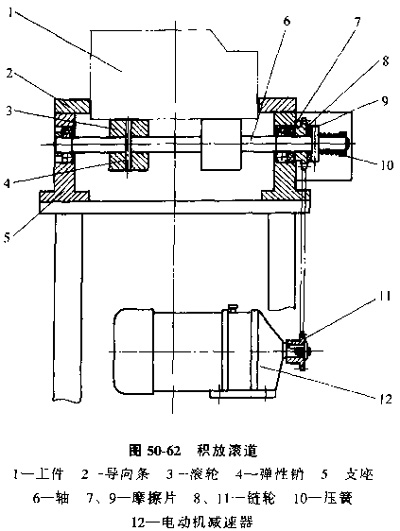 當轉(zhuǎn)軸與鏈輪、滾輪均采用剛性聯(lián)接時,傳送機屬于強制滾輪,即不論工件處于什么狀態(tài),在電動機運轉(zhuǎn)情況下,滾輪始終勻速轉(zhuǎn)動,此時如果工件被擋料器阻擋停下,滾輪與工件輸送面之間的滾動摩擦變?yōu)榛瑒幽Σ�,會加大輸送面的磨損,這時對一些材質(zhì)較軟。用已精加工面作輸送面,或?qū)斔兔婢纫蟾叩墓ぜ螂S行夾具來說是不利的,因此,現(xiàn)在多采用積放式滾子傳送機,也就是滾輪與轉(zhuǎn)軸之間,或轉(zhuǎn)軸與鏈輪之間,不采用剛性聯(lián)接,而是靠摩擦傳動,見圖50-62。當正常輸送時,驅(qū)動力通過鏈條、鏈輪、滾輪、驅(qū)動工件,工件與滾輪間為純滾動,當工件被擋住時,滾輪與轉(zhuǎn)軸或轉(zhuǎn)軸與鏈輪之間的摩擦力小于工件與滾輪間的靜摩擦,工件與滾輪保持靜止,而滾輪與轉(zhuǎn)軸,或轉(zhuǎn)軸與鏈輪之間相對打滑,從而減少了對工件輸送面的磨損。采用滾輪與轉(zhuǎn)軸相對摩擦傳動的方式,結(jié)構(gòu)相對簡單。但滾輪與轉(zhuǎn)軸間磨損較快,對輸送精度和維修更換不利。采用鏈輪端面摩擦方式,可以通過彈簧調(diào)整摩擦力。較少摩擦片磨損的影響。維修更換都比較方便,但軸向尺寸需要加大。