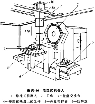 采用空架導(dǎo)軌的懸掛機(jī)器人,也屬于一種變化發(fā)展出的有軌小車,見圖50-66。在廠房內(nèi)安裝了架在空中的導(dǎo)向?qū)к�,懸掛式機(jī)器人可以由電動(dòng)機(jī)拖動(dòng)在導(dǎo)軌上行走,工件以及安裝工件托盤,可以由機(jī)器人的支持架托起,并可上下移動(dòng)和旋轉(zhuǎn)。由于機(jī)器人可以自由地在x、y方向上移動(dòng),它就可以將工件連同托盤移動(dòng)到導(dǎo)軌允許到達(dá)的任意位置上交換托盤和工件。