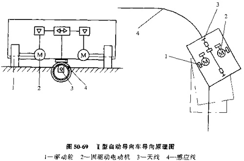 圖50-69所示是Ⅱ型自動(dòng)導(dǎo)向車的導(dǎo)向原理圖。當(dāng)天線3偏離導(dǎo)向感應(yīng)線4的左右任一側(cè)時(shí)。大線中的一對(duì)線圈的輸入信號(hào)(感應(yīng)電壓)就產(chǎn)生了信號(hào)差,通過控制系統(tǒng),使左右兩驅(qū)動(dòng)電動(dòng)機(jī)2產(chǎn)生轉(zhuǎn)速差,經(jīng)驅(qū)動(dòng)輪1使小車沿感應(yīng)線轉(zhuǎn)向,甚至信號(hào)差為零。