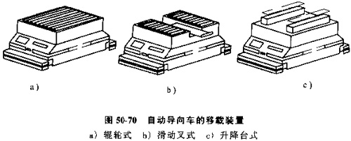 依載裝置。在小車的臺(tái)面上設(shè)置托盤或工件的傳送和接收裝置,以實(shí)現(xiàn)與機(jī)床或裝卸站之間的自動(dòng)交換聯(lián)接,圖50-70所示是裝在小車臺(tái)面上的幾種移載裝置。