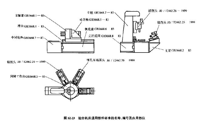 組合機(jī)床通用部件的國(guó)家及部頒標(biāo)準(zhǔn),規(guī)定了名義尺寸,參數(shù)及互換尺寸,使同一類型相同規(guī)格的通用部件可互換安裝,標(biāo)準(zhǔn)的名稱編號(hào)及應(yīng)用部件見圖52-23。