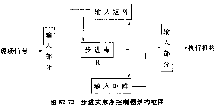 圖52-72是步進(jìn)式順序控制器的結(jié)構(gòu)框圖。現(xiàn)場(chǎng)信號(hào)通過輸入部分加到輸入矩陣,經(jīng)過輸入矩陣的邏輯運(yùn)算控制步進(jìn)器步進(jìn),步進(jìn)器R在輸出矩陣邏輯配合下送出信號(hào),完成控制過程。