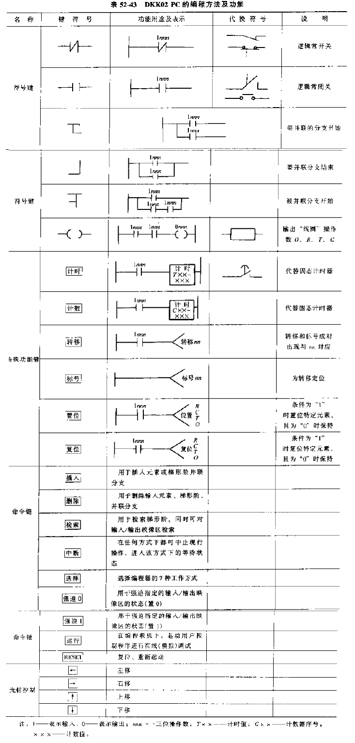 計(jì)時(shí)器32個(gè),計(jì)時(shí)范圍(0.1~9.9s),中間記憶256個(gè),順序控制的工程步進(jìn)器10個(gè),每個(gè)32步,外形尺寸485mm×220mm×150mm。該控制器特別適合于老設(shè)備的技術(shù)改造,用DKK02PC代替常規(guī)的繼電器邏輯控制可直接按原來的控制線路進(jìn)行編程,只是符號(hào)做一些變換,DKK02PC的編程方法及功能見表52-43。