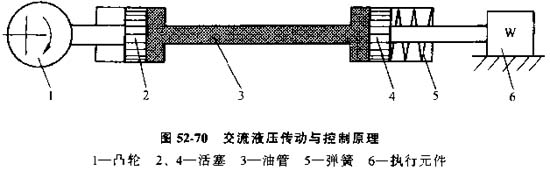 在這種控制系統(tǒng)中,凸輪1推動(dòng)活塞2移動(dòng),活塞2又迫使油管3中的油液流動(dòng),從而推動(dòng)活塞4和執(zhí)行機(jī)構(gòu)6移動(dòng),返回時(shí)靠彈簧5的彈力使整個(gè)系統(tǒng)回原位。執(zhí)行機(jī)構(gòu)的運(yùn)動(dòng)規(guī)律。由凸輪1控制。凸輪1是指令存儲(chǔ)裝置,同時(shí)又是驅(qū)動(dòng)元件,由于在這種系統(tǒng)中,工作油液是在密封的管路中往復(fù)流動(dòng),故稱(chēng)為交流液壓傳動(dòng)。