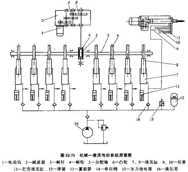 采用交流液壓傳動(dòng)控制的一個(gè)小型自動(dòng)線(xiàn)的工作原理見(jiàn)圖52-71。