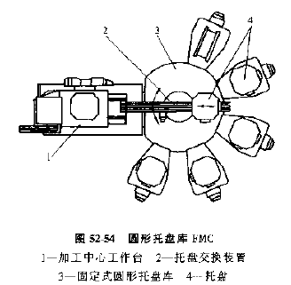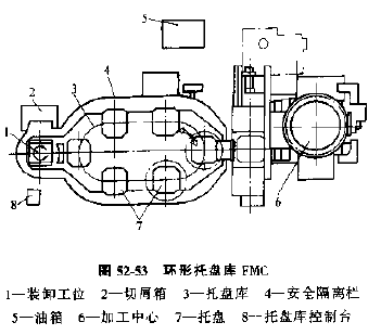 2) 圓環(huán)托板庫FMC,如圖52-54所示,其特點是托板庫是圓周分布,托板在裝卸工位,機床和托板庫各個位置之間輸送,通過庫中央的專門搬運裝置實現(xiàn)托板的輸送。