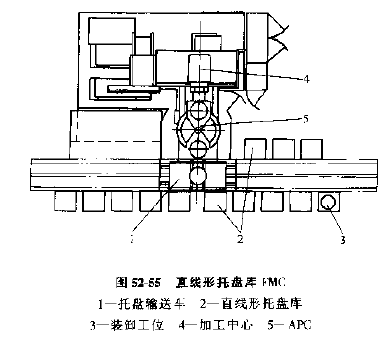 3) 直線形托板庫FMC,如圖52-55所示。相當于上述的圓形托板庫展成直線形,托板輸送裝置常為有軌小車,這種單元的優(yōu)點是具有擴展性,需要時可增加加工設(shè)備,加長運輸軌道和托板庫,擴展成更大的FMC或其他柔性制造系統(tǒng)。