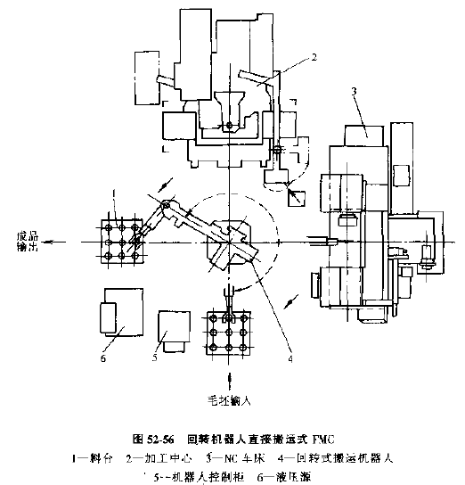 1) 回轉(zhuǎn)機器人直接搬運的FMC(見圖52-56)由1~4臺車削中心或其他數(shù)控機床,以及固定安裝的回轉(zhuǎn)式機器人和工件存貯臺等組成,各設(shè)備都布置在機器人周圍或兩側(cè),工件在加工過程中的搬運都由機器人自動實現(xiàn)。