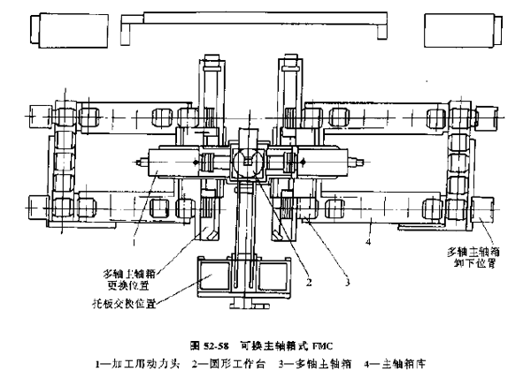(3) 可換主軸箱式FMC,這種單元以多軸加工為主,適于品種不多的中、大批量的生產(chǎn),加工設(shè)備是可更換主軸箱的組合機床,單元內(nèi)設(shè)有主軸庫及其運輸交換裝置,圖52-58所示為可換箱式FMC。工件通過托板交換裝置,從、外部系統(tǒng)進入單元,送上圓形回轉(zhuǎn)工作臺夾緊,然后由兩側(cè)裝有相應(yīng)主軸箱的動力頭驅(qū)動加工。