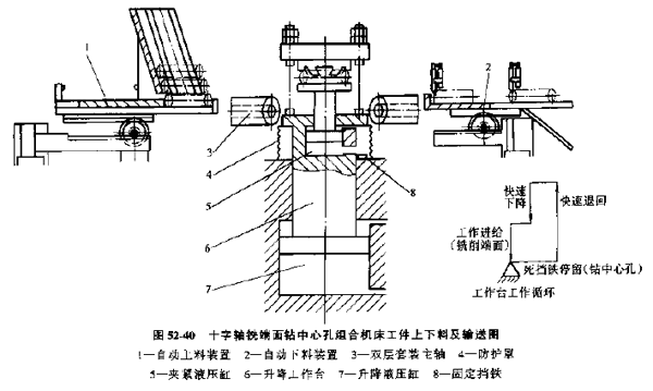 機(jī)床方案分析;由于需要的生產(chǎn)率較高,應(yīng)采用多面組合機(jī)床(見(jiàn)圖52-39),同時(shí)對(duì)四個(gè)軸頸加工,銑端面和鉆中心孔兩道工序可合并在一個(gè)工位上進(jìn)行。工件在輸送過(guò)程中停留實(shí)現(xiàn)銑削加工,輸送部件靠死擋鐵停留時(shí),由四面同時(shí)鉆中心孔,根據(jù)這種方案,機(jī)床主軸可以采用雙層套裝的結(jié)構(gòu)形式,外層主軸裝有套形銑刀銑十字軸端面,因主軸裝中心孔鉆頭,并用單獨(dú)的軸向進(jìn)給液壓缸進(jìn)給鉆孔。為了提高機(jī)床自動(dòng)化程度。還設(shè)有自動(dòng)上下料裝置(見(jiàn)圖52-40)。工件裝入傾斜料倉(cāng)內(nèi),由推料托盤(pán)送入垂直移動(dòng)的輸送臺(tái)臺(tái)面上。由液壓缸把工件頂起向上夾緊,夾具定位板由兩根支柱支承,定位面朝下,可避免定位面上積屑。工件夾緊后垂直向下快進(jìn),轉(zhuǎn)為工作進(jìn)給后進(jìn)行銑削,靠固定擋鐵停留時(shí)進(jìn)行鉆中心孔,然后快退到原始位置停止,完成全部加工,機(jī)床還設(shè)有自動(dòng)檢查所銑端面距離及中心孔深度上下限尺寸的裝置,并給出合格與否的信號(hào)。合格工件自動(dòng)滑入料箱,實(shí)現(xiàn)加工的全部自動(dòng)化。