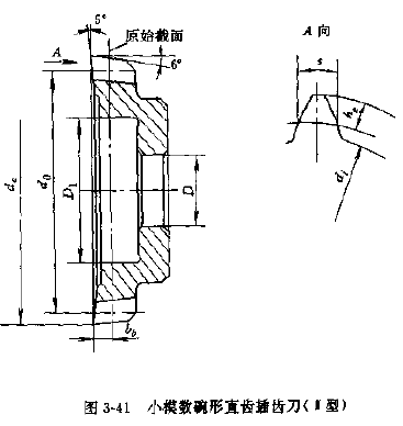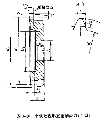 小模數(shù)直齒插齒刀,小模數(shù)直齒插齒刀已經(jīng)標(biāo)準(zhǔn)化,JB3095—82《小模數(shù)直齒插齒刀》中規(guī)定了盤形,碗形和錐柄三種型式的插齒機(jī)。盤形直齒插齒刀(Ⅰ型),其標(biāo)稱分度圓直徑為40,63mm兩種,精度等級(jí)分AA、A、B三種,其型式和尺寸見圖3-40和表3-93~表3-94。表3-97~表3-98。