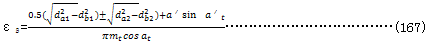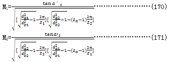 式中da1(da2),db1(db2),Z1(Z2)分別為小輪(大輪)的齒根圓、基圓直徑和齒數(shù);a′t為端面分度圓嚙合角,見式(160);εa為端面重度,見式(167)。