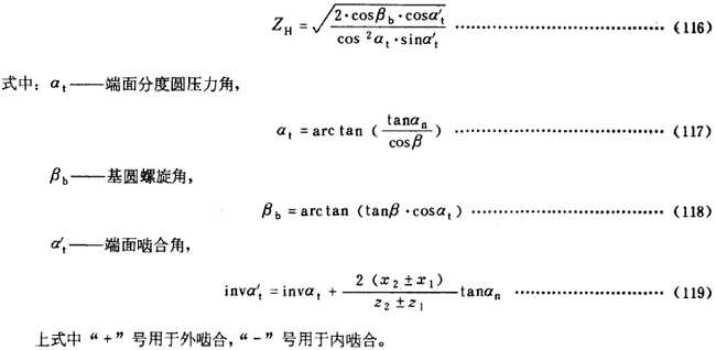 ZH數(shù)值可由式(116)計(jì)算得出。對(duì)于具有法面齒形角αn為20°,22.5°,25°的內(nèi)、外嚙合齒輪,ZH也可由圖22,圖23和圖24根據(jù)比值(x2±x1)/(z2±z1)及螺旋角β查得。