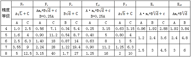 ①切向綜合公差Fi′、一齒切向綜合公差Fi′、螺旋線波度公差ffβ、軸向齒距極限偏差±FPK、一個軸向齒距偏差fpx、中心距極限偏差fa分別按下列計算式計算: