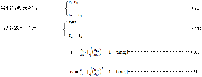 重合度系數(shù)Kε是考慮在忽略載荷分配時(shí),將小輪齒頂?shù)拈W溫值轉(zhuǎn)換為沿嚙合線閃溫平均值的系數(shù)。重合度系數(shù)可以用齒高重合度ε1與ε2以及它們的和εa來(lái)表示。Xε的公式是基于假定沿嚙合線的閃溫是線性分布的。這種方法的可能誤差將不會(huì)超過(guò)5%,且偏于安全。