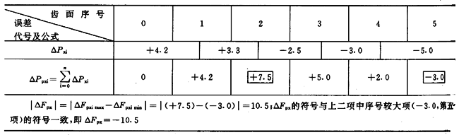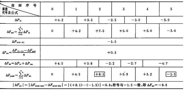 由指示表讀出的逐齒軸向齒距偏差ΔPxi經(jīng)計(jì)算得到ΔFPX(見表13)。