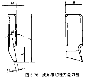 成對(duì)滾切銑刀盤切齒時(shí),兩把銑刀盤在工件的同一齒槽內(nèi)工作,一把切削左齒面,另一把切削右齒面,切齒時(shí)有展成運(yùn)動(dòng),銑刀盤工作側(cè)刃與銑刀端面之間通常作出一個(gè)角,使產(chǎn)形輪的齒面成為一個(gè)凹錐面,因此切出的齒輪齒長(zhǎng)方向呈中鼓形,有利于嚙合,根據(jù)使用機(jī)床的不同,銑刀盤的直徑有150。270及600mm,其中以直徑為600mm的銑刀盤應(yīng)用最廣。刀齒的凹入角δ有1°30′、2°30′和5°三種,常用的成對(duì)滾切銑刀盤刀齒的尺寸見圖3-76和表3-149~表3-151。
